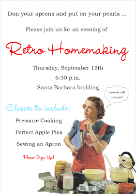 We had a retro-themed homemaking night, complete with classes about pressure cooking, making apple pies (in a jar - cute!), and sewing an apron.